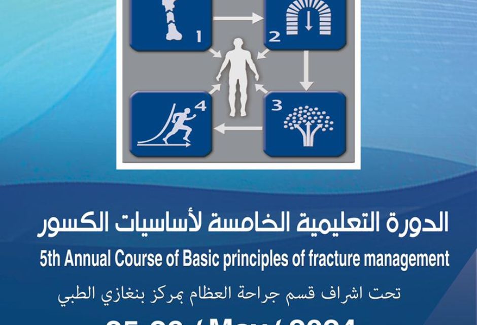 تقام الدورة التدريبية الخامسة لأساسيات تثبيت الكسور -صباح اليوم- السبت الموافق 25 مايو 2024 م بقاعة بنينا في مركز بنغازي الطبي .