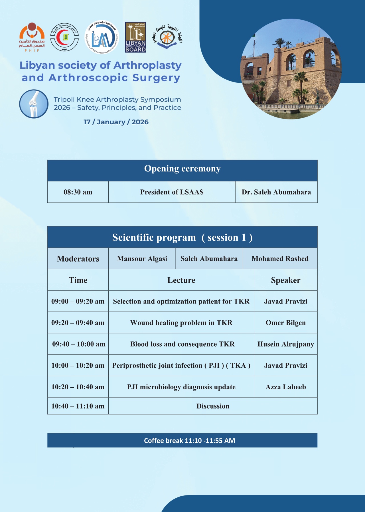 الزملاء الأعزاء، في إطار الدور العلمي والمهني للجمعية الليبية لجراحة وتنظير المفاصل، وحرصها الدائم في المساهمة لدعم وتأهيل أطباء جراحة العظام، يسعدنا ان نعلن عن البرنامج العلمي لندوة جراحة مفصل الركبة الصناعية ليوم 17.يناير .2026 فندق كرونتيا طرابلس . يشرفنا أن يكون من بين ضيوف هذا اليوم العلمي البروفيسور برفيزي، أحد أبرز أعلام جراحة العظام والمفاصل مع نخبة من الزملاء المشاركين من دول العالم ، سيكون هناك محاضرات علمية متخصصة لتحديات الالتهابات البكتيرية المصاحبة لجراحات المفاصل الصناعية (PJI)، والتي تُعد من أخطر وأهم مضاعفات هذا النوع من الجراحات. كذلك محاضرات لعدد من المشاكل الميكانيكية الشائعة المرتبطة بجراحة مفصل الركبة الصناعية سواء أثناء العملية الجراحية أو بعدها، على المدى القريب والبعيد، مع التركيز على إيصال المفاهيم الحديثة لهذا النوع من الجراحات وفق المعايير العلمية المعتمدة دوليًا. ويتضمن البرنامج العلمي أيضًا محاضرات متخصصة في علم الأحياء الدقيقة السريري، في محاولة لبناء آلية عمل تكاملية بين جراحة العظام والأحياء الدقيقة، بما يسهم في فهم أعمق لطبيعة هذه العلاقة وتجسيدها من خلال ممارسات علمية وعملية قابلة للتطبيق على الصعيد الوطني، وذلك بهدف ترشيد الاستخدام العلمي للمضادات الحيوية وفق معايير وضوابط علمية والحد من الإفراط في استعمالها، بما ينعكس إيجابًا على نتائج العلاج وسلامة المرضى. نأمل أن تشكل هذه الندوة العلمية منصة فاعلة للحوار وتبادل الخبرات، وأن نخرج منها بتوصيات عملية تُسهم بشكل مباشر في تطوير الخدمات الصحية، من حيث التجهيز، والأمان، والتأهيل في مجال جراحة مفصل الركبة الصناعية. وتفضلوا بقبول فائق التقدير والاحترام. د. صالح ابومهارة رئيس الجمعية الليبية لجراحة وتنظير المفاصل