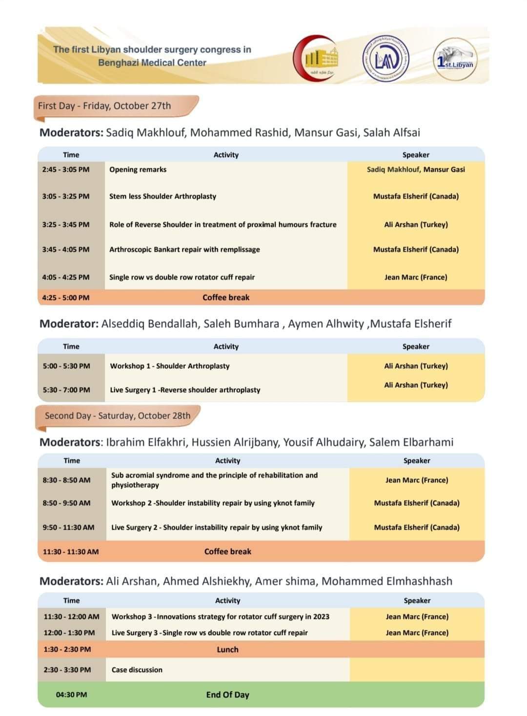 We are confident that the First Shoulder Surgery Conference will be an excellent opportunity to exchange experiences and knowledge and develop the capabilities of physicians and surgeons in this important field. We look forward to meeting the physicians and specialists participating in the First Shoulder Surgery Conference at the Benghazi Medical Center at this pioneering event, and we wish you all a fruitful and successful experience at this conference.